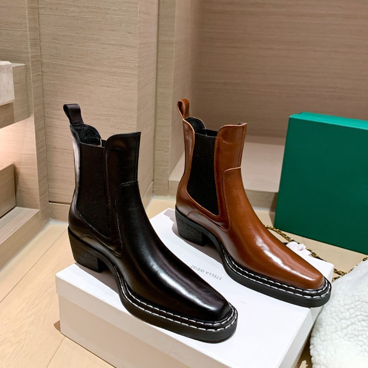 Vintage chunky heel women's short boots small square toe Chelsea boots mid heel